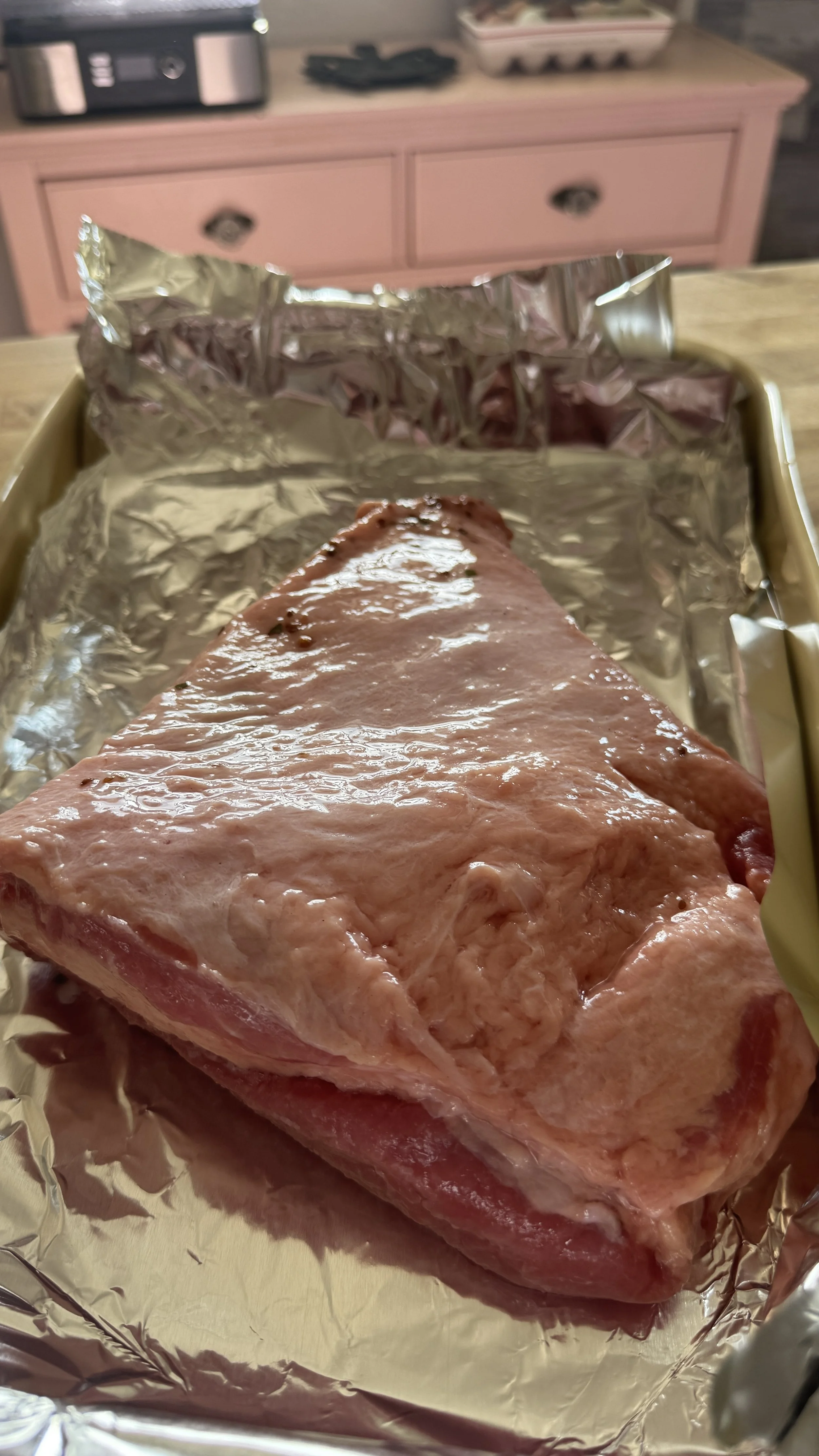 Set in roasting pan lined with foil fatty side up